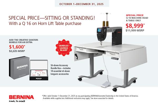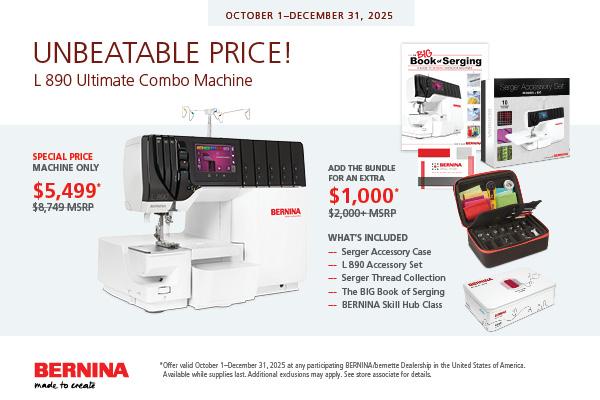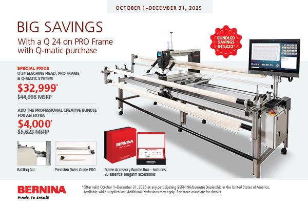 * - Offer valid May 1-31, 2025 only at Top Shelf Quilts, a participating BERNINA Dealerships in the United States of America. Up to 25% off MSRP offer applies to the purchase of one (1) new BERNINA domestic/overlocker machine with a retail purchase price of $999 MSRP or more with a trade-in of any brand or model sewing machine OR to the purchase of one (1) new BERNINA Longarm Quilting Machine with a retail purchase price of $6,999 or more with a trade-in of any brand or model longarm machine. Top Shelf Quilts has final decision on brand, model and condition of sewing/embroidery/quilting/overlocker machine that are eligible for trade-in that shall establish trade-in value. Applicable only to brand new machines. The BERNINA 990 machine is excluded from this offer. Savings discount will be applied at the time of purchase. Prices set by BERNINA Dealer may vary. Not valid on previous purchases or combined with any other offers or coupons. Available while supplies last, not applicable to any back orders or out-of-stock items. Taxes are not included in the total purchase calculation. Customer is responsible for all applicable sales tax. If customer returns the product(s) purchase discount will be lost. Offer is not transferable, not redeemable for cash, and has no cash value. Offer and its terms are subject to change. Offer void where prohibited by law.