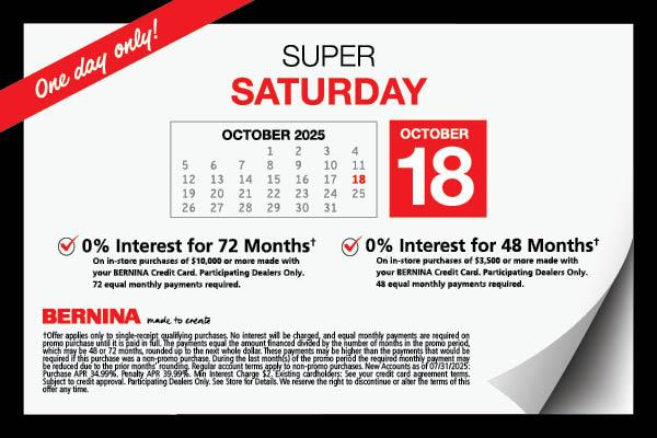 18 MONTHS†† NO INTEREST ON YOUR QUALIFYING PURCHASE OF $2,000 OR MORE MADE WITH YOUR BERNINA CREDIT CARD. 18 EQUAL MONTHLY PAYMENTS ARE REQUIRED. Promo fee of 2% of amount financed will be included in the required monthly payments.