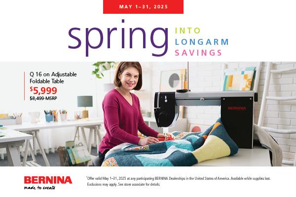 * - Offer valid May 1-31, 2025 only at Top Shelf Quilts, a participating BERNINA Dealerships in the United States of America. Up to 25% off MSRP offer applies to the purchase of one (1) new BERNINA domestic/overlocker machine with a retail purchase price of $999 MSRP or more with a trade-in of any brand or model sewing machine OR to the purchase of one (1) new BERNINA Longarm Quilting Machine with a retail purchase price of $6,999 or more with a trade-in of any brand or model longarm machine. Top Shelf Quilts has final decision on brand, model and condition of sewing/embroidery/quilting/overlocker machine that are eligible for trade-in that shall establish trade-in value. Applicable only to brand new machines. The BERNINA 990 machine is excluded from this offer. Savings discount will be applied at the time of purchase. Prices set by BERNINA Dealer may vary. Not valid on previous purchases or combined with any other offers or coupons. Available while supplies last, not applicable to any back orders or out-of-stock items. Taxes are not included in the total purchase calculation. Customer is responsible for all applicable sales tax. If customer returns the product(s) purchase discount will be lost. Offer is not transferable, not redeemable for cash, and has no cash value. Offer and its terms are subject to change. Offer void where prohibited by law.
