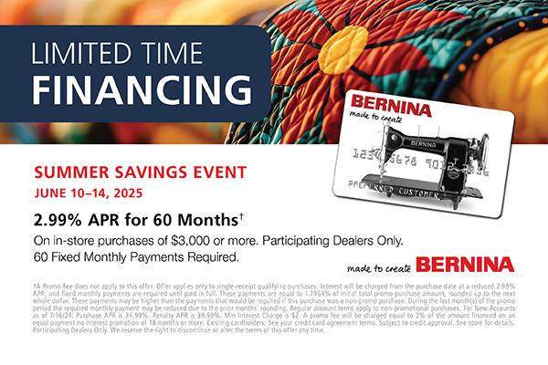 18 MONTHS†† NO INTEREST ON YOUR QUALIFYING PURCHASE OF $2,000 OR MORE MADE WITH YOUR BERNINA CREDIT CARD. 18 EQUAL MONTHLY PAYMENTS ARE REQUIRED. Promo fee of 2% of amount financed will be included in the required monthly payments.