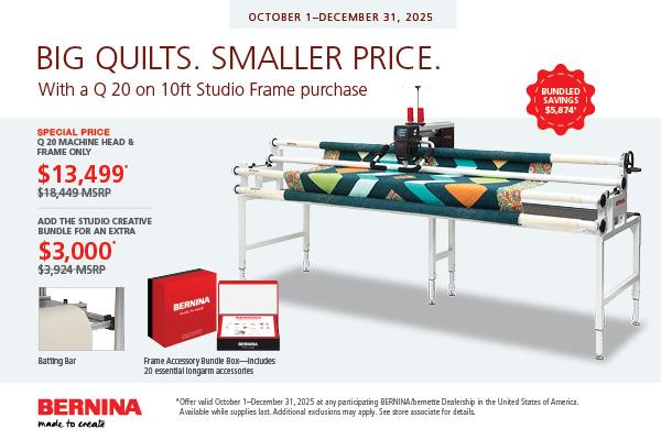 * - Offer valid May 1-31, 2025 only at Top Shelf Quilts, a participating BERNINA Dealerships in the United States of America. Up to 25% off MSRP offer applies to the purchase of one (1) new BERNINA domestic/overlocker machine with a retail purchase price of $999 MSRP or more with a trade-in of any brand or model sewing machine OR to the purchase of one (1) new BERNINA Longarm Quilting Machine with a retail purchase price of $6,999 or more with a trade-in of any brand or model longarm machine. Top Shelf Quilts has final decision on brand, model and condition of sewing/embroidery/quilting/overlocker machine that are eligible for trade-in that shall establish trade-in value. Applicable only to brand new machines. The BERNINA 990 machine is excluded from this offer. Savings discount will be applied at the time of purchase. Prices set by BERNINA Dealer may vary. Not valid on previous purchases or combined with any other offers or coupons. Available while supplies last, not applicable to any back orders or out-of-stock items. Taxes are not included in the total purchase calculation. Customer is responsible for all applicable sales tax. If customer returns the product(s) purchase discount will be lost. Offer is not transferable, not redeemable for cash, and has no cash value. Offer and its terms are subject to change. Offer void where prohibited by law.