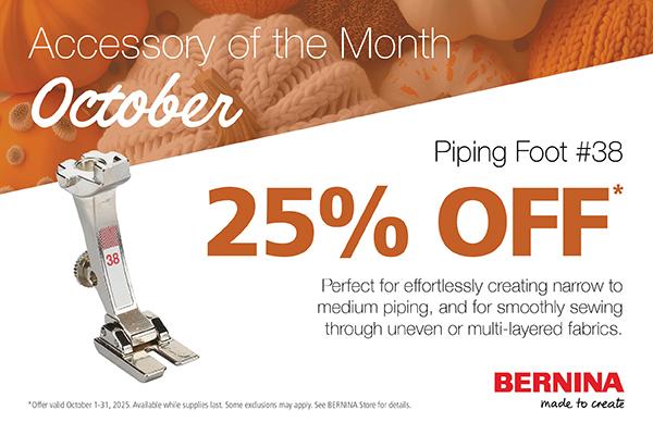 *** Offer valid May 1-31, 2025 at Top Shelf Quilts, a participating authorized BERNINA/bernette Stores in the United States of America. Offer applies only to the purchase of new BERNINA or bernette Presser Feet or BERNINA BIG Books. Discount is off MSRP and will be taken on the foot or BIG Book with the lowest retail price. Offer not valid on previous purchases or with any other offers or coupons. Some exclusions may apply. Subject to availability. Available while supplies last. Taxes not included in total purchase calculation. Customer is responsible for all applicable sales tax. Offer is not transferable, not redeemable for cash, and has no cash value. Offer and its terms are subject to change. Offer void where prohibited by law.